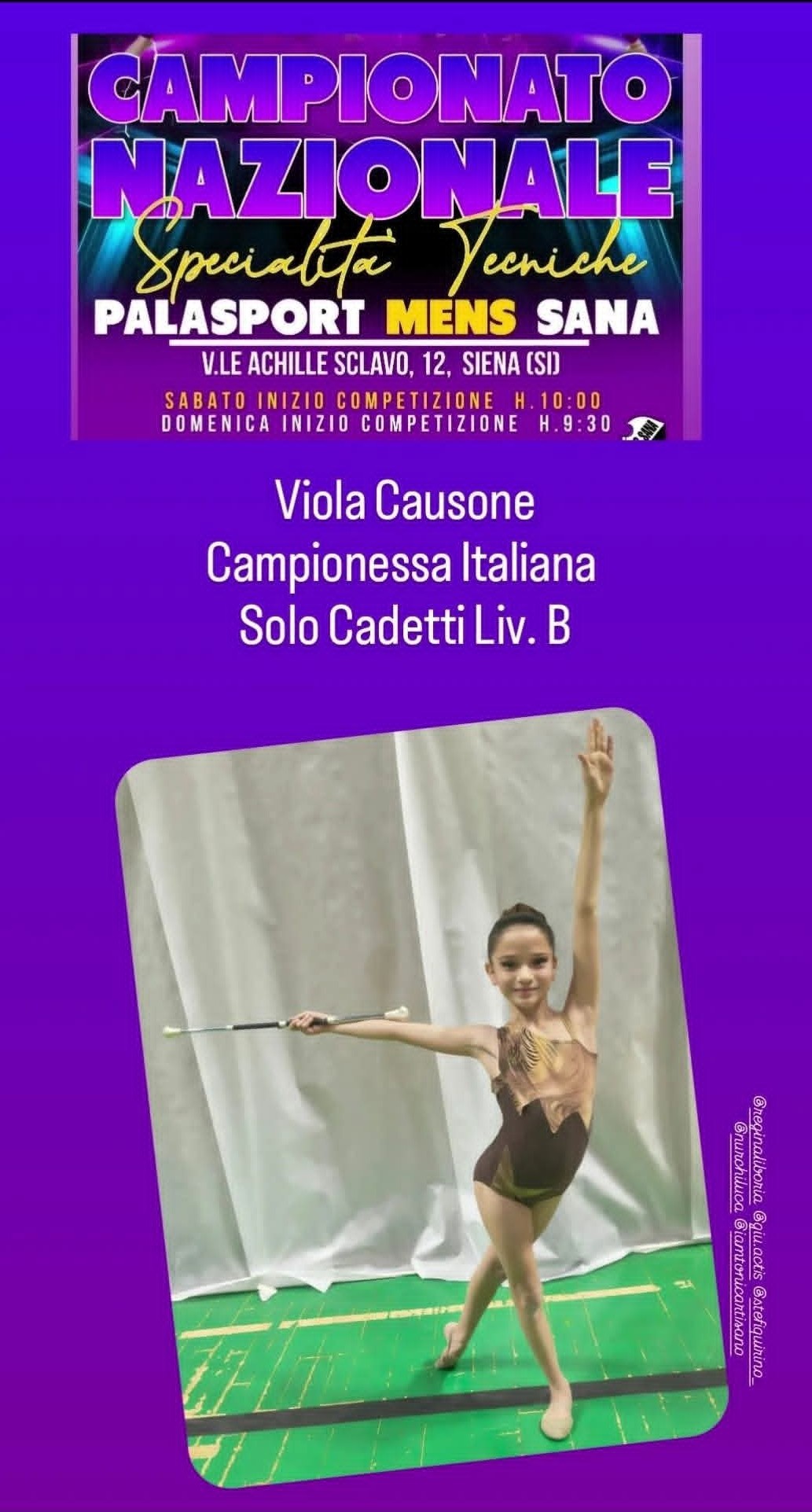 È con immenso orgoglio che il comune di Maglione celebra il successo di Viola Causone, appena incoronata campionessa Italiana cadetti livello B nella specialità tecniche, titolo conquistato con impegno, determinazione e grande passione al Palasport di Mens Sana presso il comune di Siena.
